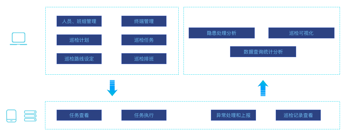 PC端进行人员班组管理、终端管理,制定巡检计划和设定巡检路线,并进行巡检排班和任务下发,同时接收巡检终端的巡检信息,可进行隐患分析处理、巡检可视化查看以及数据查询统计分析。